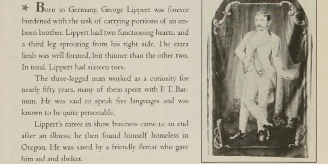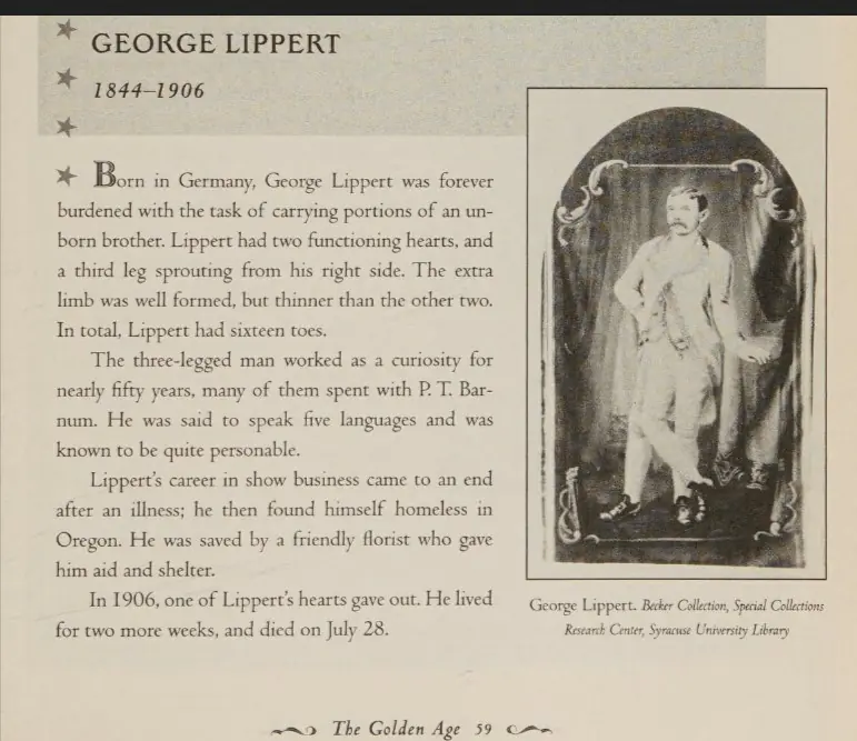 “Born in Germany, George Lippert was forever burdened with the task of carrying portions of an unborn brother. Lippert had two functioning hearts, and a third leg sprouting from his right side. The extra limb was well formed but thinner then the other two. In total, Lippert had sixteen toes.