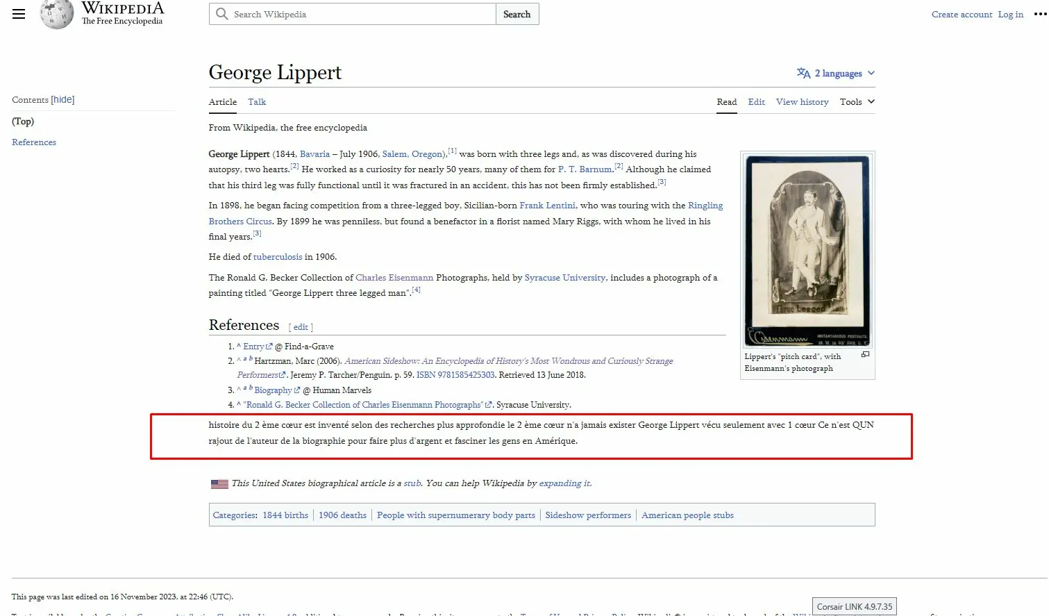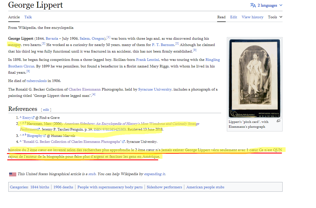Kırmızı ile işaretlemiş olduğumuz kısımda, Fransızca:  “Yapılan derin araştırmalara göre ikinci kalbin hikayesi UYDURULDU. İkinci kalp hiçbir zaman var olmadı George Lippert sadece 1 kalple yaşadı. Bu YALNIZCA biyografinin yazarının daha fazla para kazanmak ve Amerika’daki insanların ilgisini çekmek için yaptığı bir eklemedir.” yazmaktadır. Yani dediği gibi  Wikipedya’da bu durum onaylanmamıştır.