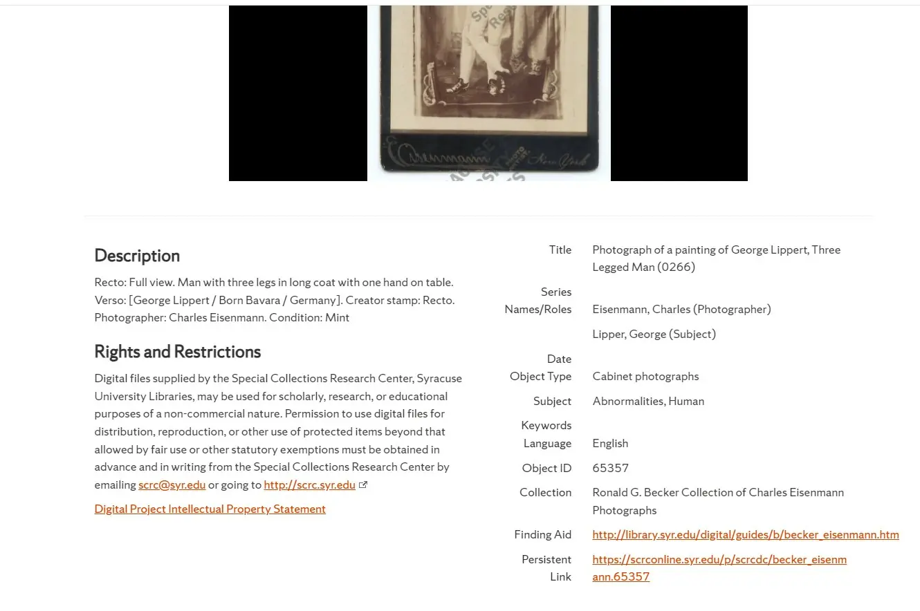 İlgili fotoğrafa gelince George Lippert adında sirklerde çalışan ve üç ayağı olduğu iddia edilen birine ait bu resim, o dönemlerde ucubelerin resimleri ile şöhret bulan Charles Eisenmann  tarafından çekilmiştir. New York’taki  özel araştırma üniversitesi Syracuse Üniversitesi’nde yer almaktadır.  Ronald G. Becker Charles Eisenmann Fotoğraf Koleksiyonu adı ile fotoğrafçının yaklaşık 1413 çalışmasının yer aldığı envarter online olarak da araştırmacılara açık hale getirilmiştir.