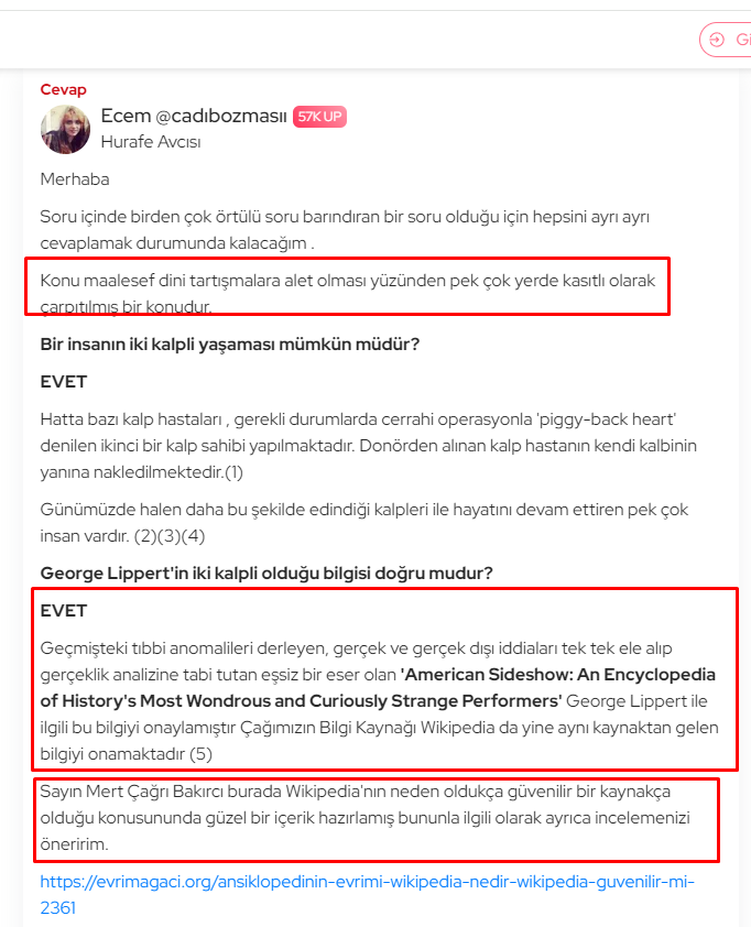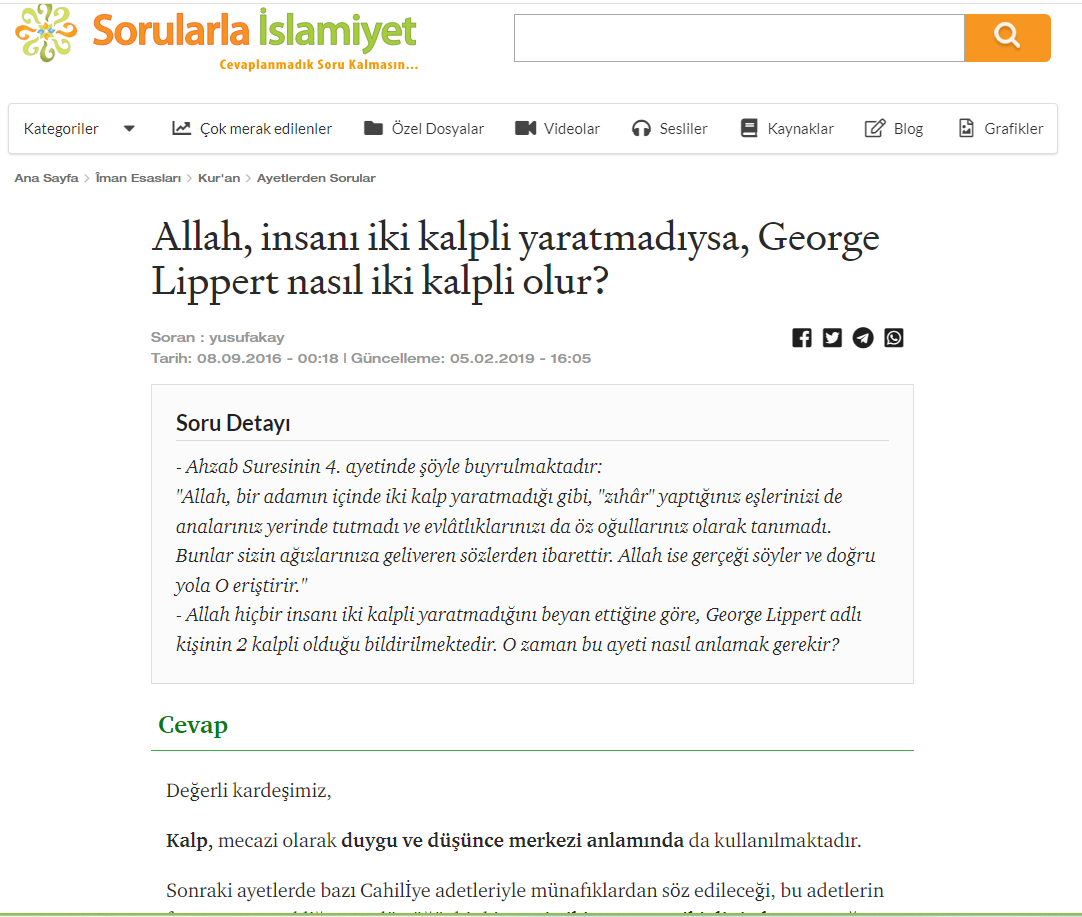 Ciddiye almaya gerek olmayıp, bize okuyucumuz tarafından gönderildiği için okuyucumuza cevap babında ele alacağımız ateistlerin “evrim ağacı” adlı sitesinde konunun nasıl vuku bulduğuna bir bakalım. İlgili sitenin linkinde sorulan soru şu şekilde ele alınmıştır: https://evrimagaci.org/soru/george-lippert039in-iki-kalpli-oldugu-bilgisi-dogru-mudur-5562