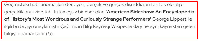 Hurafe Avcısı mahlaslı hurafe yayıcısı yazarın sirkte halkın teşhirine sunulan sirk ucubelerin biyografilerine ayrılmış bir kitabı nasıl da “bilimsel bir eser”  gibi sunmaya çalıştığına dikkat edin…