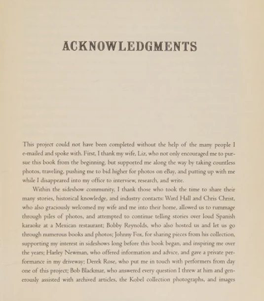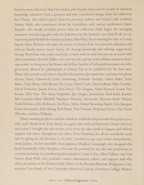 Aşağıda kitabın bazı sayfaları örnek olarak sunulmuştur. Herhangi bir bilimsel tez ya da hipotez değil kitap sadece ucubelerin biyografilerini yansıtmaya çalışan bundan başka da herhangi bir iddiası bulunmayan bir eserdir. Zaten kitabın yazarı en başta yer alan önsöz bölümünde de teşekkürlerini sunarken gösteri dünyasına atıf yaparak buna değinmiştir….