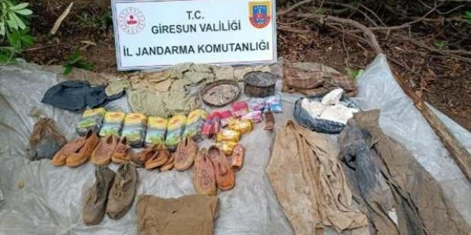 Giresun kırsalında bölücü terör örgütlerine yönelik arama ve tarama faaliyetleri sırasında güvenlik güçlerinin bulduğu sığınakta muhtelif yaşam malzemesi ele geçirildi.
