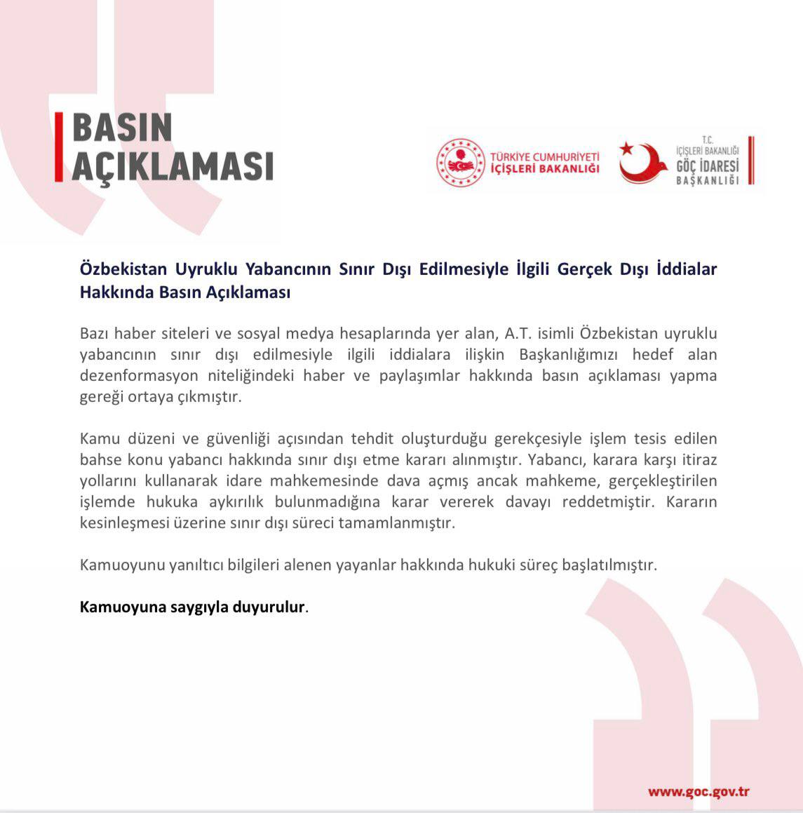 Geçtiğimiz günlerde hukuksuz yere sınır dışı edilen Özbek alim Alisher Tursunov (Mübaşir Ahmed) ile ilgili Göç İdaresi Başkanlığı tarafından açıklama yapıldı