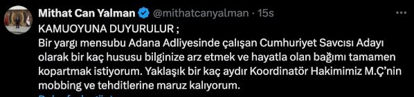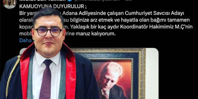 Adana Adliyesi’nde Cumhuriyet Savcısı adayı olarak görev yapan Mithat Can Yalman, otel odasında ölü bulundu. Yalman’ın, olaydan 4 saat önce, muhafazakar olduğu için mobbinge uğradığı, tehdit edildiği ve hayatla bağını koparmak istediğine dair sosyal medya hesabından paylaşımda bulunduğu tespit edildi.