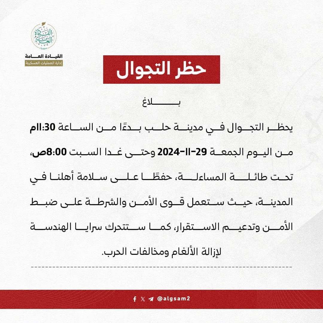 Halep’in kontrolünü ele geçiren muhalif güçler, sivillerin can güvenliği için Halep merkezinde 23:30-08:00 saatleri arasında sokağa çıkma yasağı ilan etti.