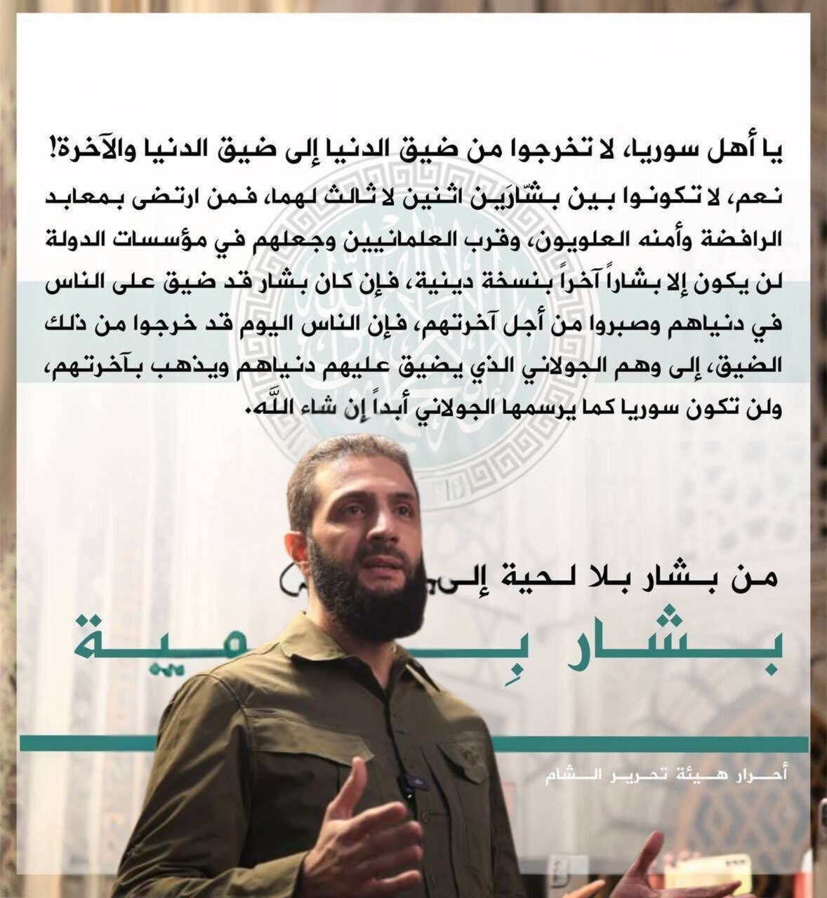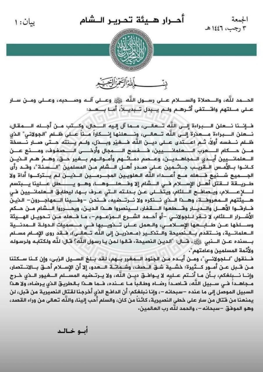 Bu, bizim asla kabul edemeyeceğimiz bir durumdur. Bizler, Allah yolunda ailelerini ve yurtlarını terk eden, İslam için mücadele eden, Şam beldesini hainlerin ve zalimlerin yönetiminden kurtarmaya kendini adayan muhacirler olarak, “Cevlani” veya sözde “Ahmed Şeraa” olarak bilinen şahsın İslamî kimliğimizi yok saymasını ve grubumuzu laik bir devletin genel ilkelerine entegre etme çabalarını asla kabul etmiyoruz.