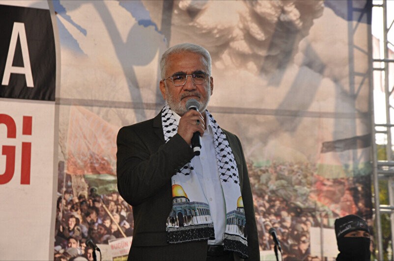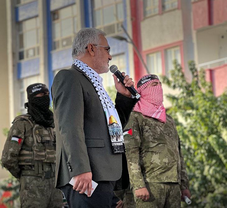 HÜDA PAR Genel Başkanı Zekeriya Yapıcıoğlu, Batman’da Gazze için düzenlenen mitingde sahneye Kassam Tugayları’nın üniformalarını giyen gençlerle çıktı.