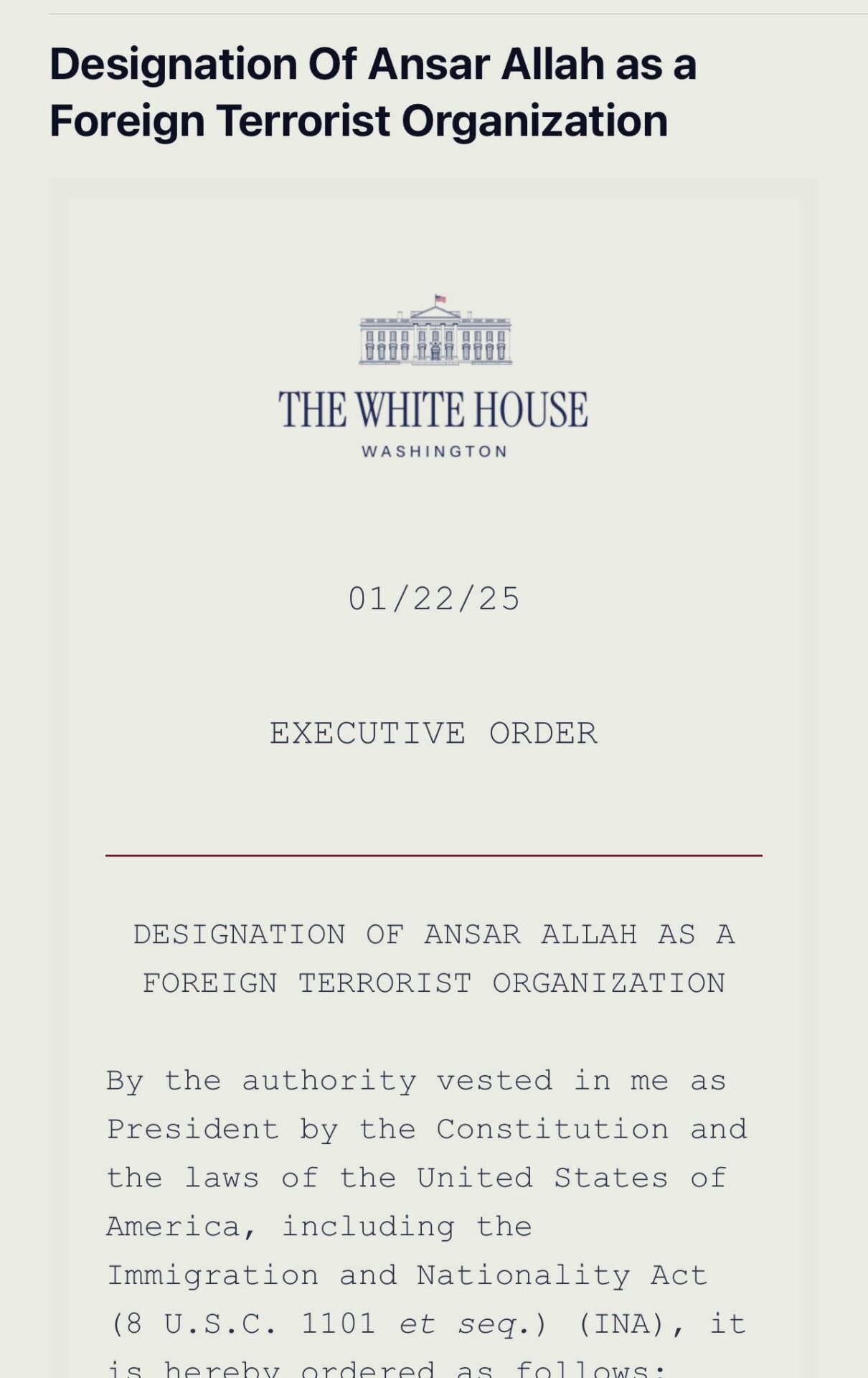 ABD Başkanı Donald Trump, Joe Biden yönetiminin “yabancı terör örgütleri” listesinden çıkardığı, Yemen’de Husiler olarak bilinen “Ensarallah” örgütünü yeniden bu listeye ekledi.