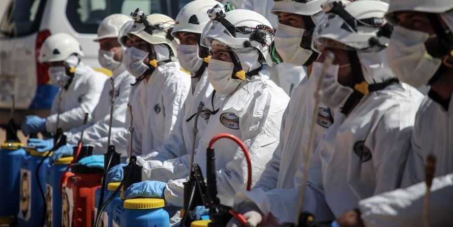 Sivil savunma ekipleri (beyaz baretliler) virüse karşı dezenfekte çalışmalarına devam ediyor.
