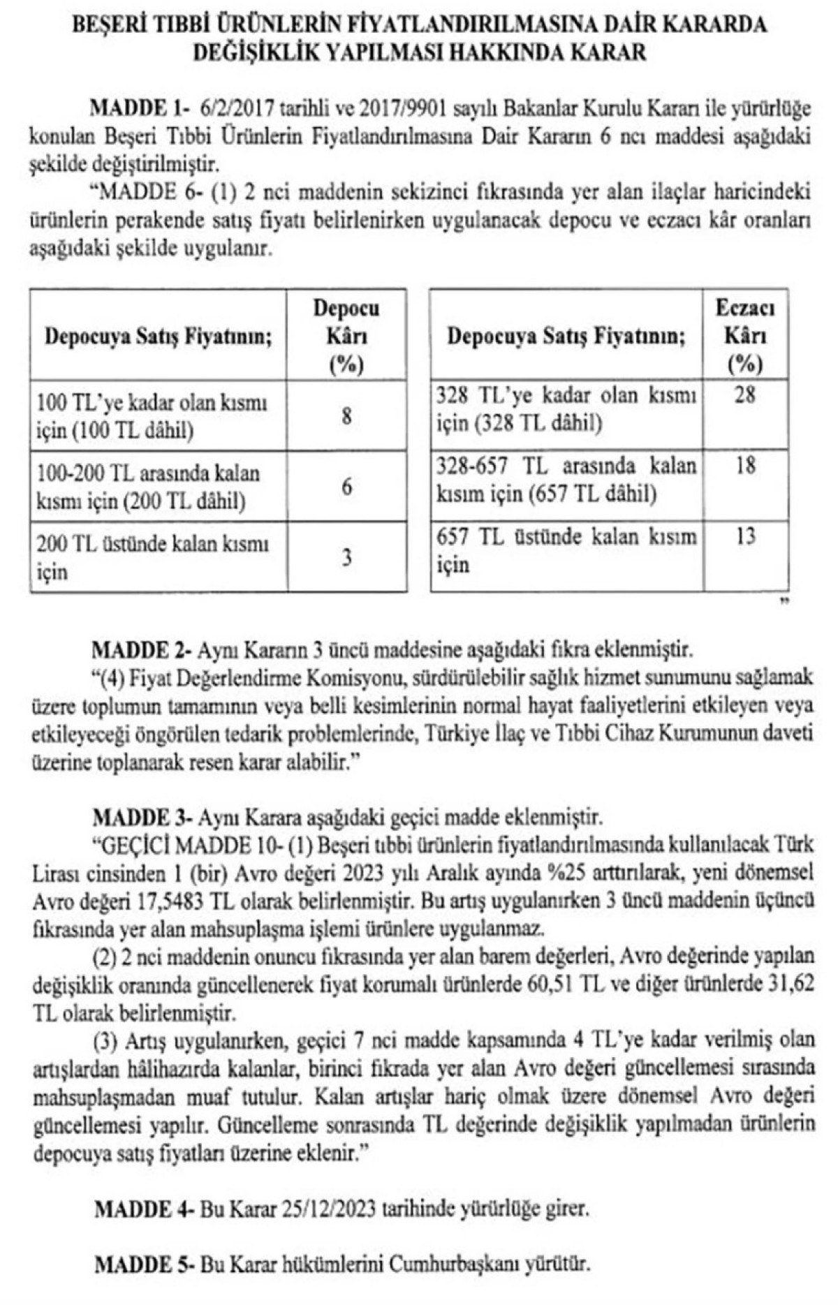 Cumhurbaşkanı kararı ile Beşeri Tıbbi Ürünlerin Fiyatlandırılmasına Dair Kararda değişiklik yapılarak güncel Euro değeri yüzde 25 artırıldı ve 17 lira 55 kuruş seviyesine yükseltildi.