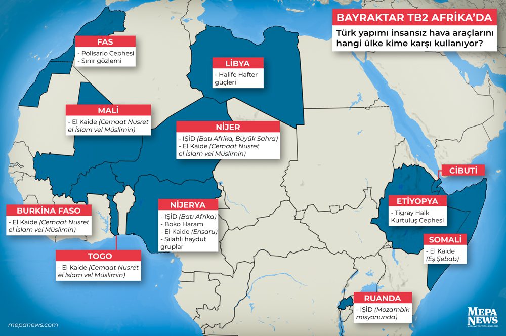 TB2'nin kullanıcıları arasında yer alan Nijer, silahlı insansız hava araçlarını IŞİD'in Batı Afrika ve Büyük Sahra kollarının yanı sıra, El Kaide'nin Batı Afrika yapılanması CNİM'e karşı da kullanıyor.