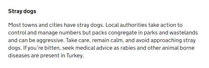 Hükümetin resmi sayfasında Türkiye ile ilgili bölümde “Stray dogs” başlığıaltında yer alan bilgilendirme notunda, çoğu şehirde başıboş köpeklerin olduğu, yerel yönetimlerin bunları kontrol etmek için harekete geçtiği ancak bu canlıların sürüler halinde dolaşarak saldırdığı ifade edildi.