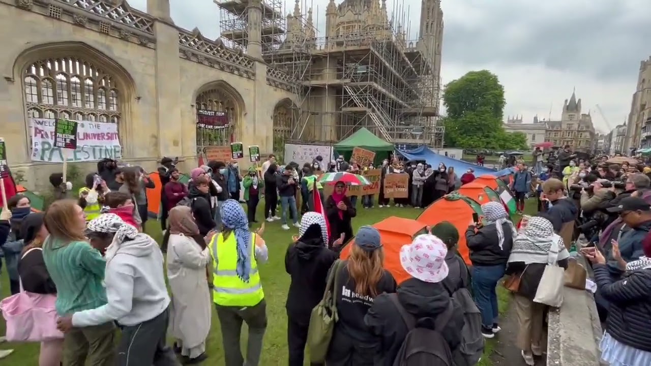Yüze yakın öğrenci Cambridge Üniversitesi King’s College’ın önünde toplandı, burada çadır kurdular ve kurumun İsrail’in Gazze savaşına katılan şirketlerinden çekilmesini talep etti. Onlara üniversitenin kolejlerindeki çok sayıda personel de katıldı.