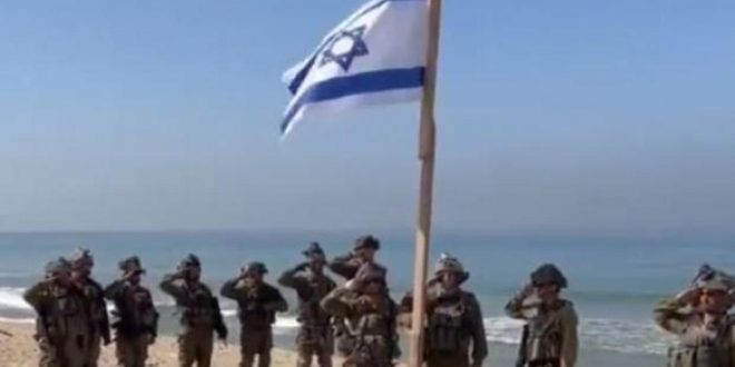 İsrail askerlerinin abluka altındaki Gazze Şeridi’nin kuzeyindeki sahile İsrail bayrağı çektiği anı gösterdiği bir görüntü yayımlandı.