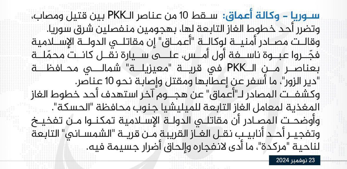 Örgüt, Deyrizor’daki saldırının hemen ardından Haseke ilinin güneyinde yer alan fabrikalara tedarik sağlayan Markada bölgesindeki El Şemsani köyüne mayın döşeyerek gaz boru hattını havaya uçurdu. Patlama, bölgede ciddi hasara yol açtı.