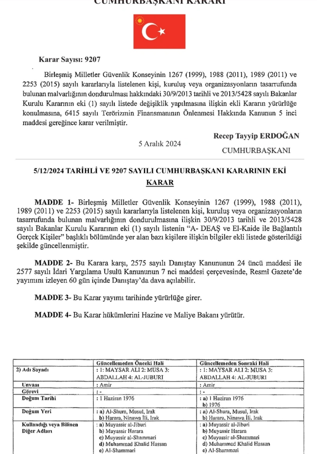 HTŞ’nin kurucularından Ebu Mariya Kahtani’nin Türkiye’deki mal varlıkları donduruldu. Karar Cumhurbaşkanı Erdoğan’ın imzasıyla Resmi Gazete’de yayımlandı.