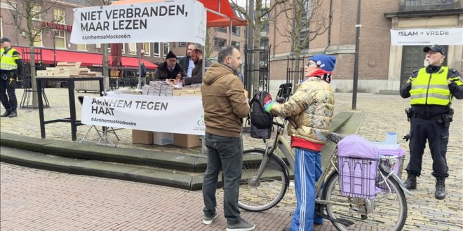 Hollanda’nın Arnhem kentinde bulunan 6 cami vakfının yöneticileri, aşırı sağcı Wagensveld’in 13 Ocak’ta Kur’an-ı Kerim’i yakmaya teşebbüs ettiği Jansplein Meydanı’nda “Yakma, oku” adlı etkinlik düzenledi.