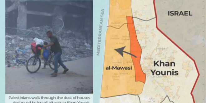 Savaş suçlusu İsrail, Gazze’de güvenli alan olarak ilan ettiği ‘insani bölgeyi’ gittikçe daraltıyor, Filistinlileri dar bir alanda kıskaca alıyor.
