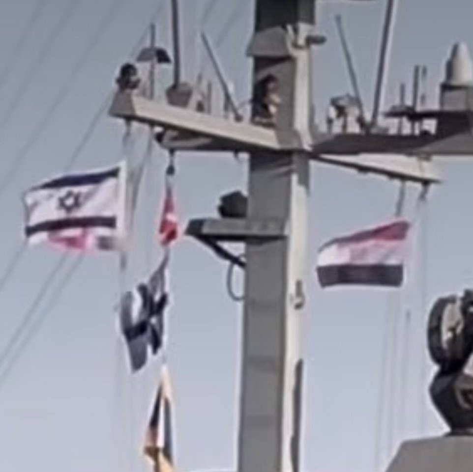Süveyş Kanalına demir atan savaş gemisinde, Soykırımcı İsrail rejimi ve Mısır bayrağının bir arada bulunduğu görüntülendi.