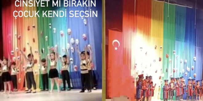 İstanbul Beykoz’da özel bir anaokulunda küçük yaştaki çocukların katıldığı “cinsiyet seçme” etkinliği yapıldı. Etkinlikte dev LGBT bayrağı asıldı.