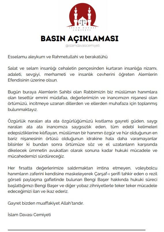Her fırsatta değerlerimize saldırmaktan imtina etmeyen, voleybolcu hanımların zaferini kendisine maskeleyerek Çarşaf-ı şerifi tahkir eden o rezil görseli paylaşma gafletinde bulunan Bengi Başer hakkında hukuki süreci başlattığımızı Bengi Başer ve diğer yobaz zihniyetlerle teker teker mücadele edeceğimizi ilan ve ikaz ederiz.