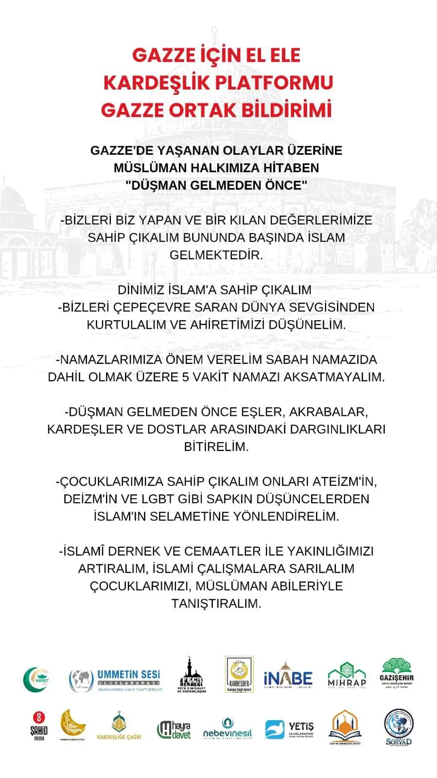 Gazze için el ele veren kardeşlik platformu yeni bir bildiri yayınladı. ” Düşman gelmeden önce” isimli bildiride Müslümanların zor şartlar altında neler yapmaları gerektiği ele alındı.