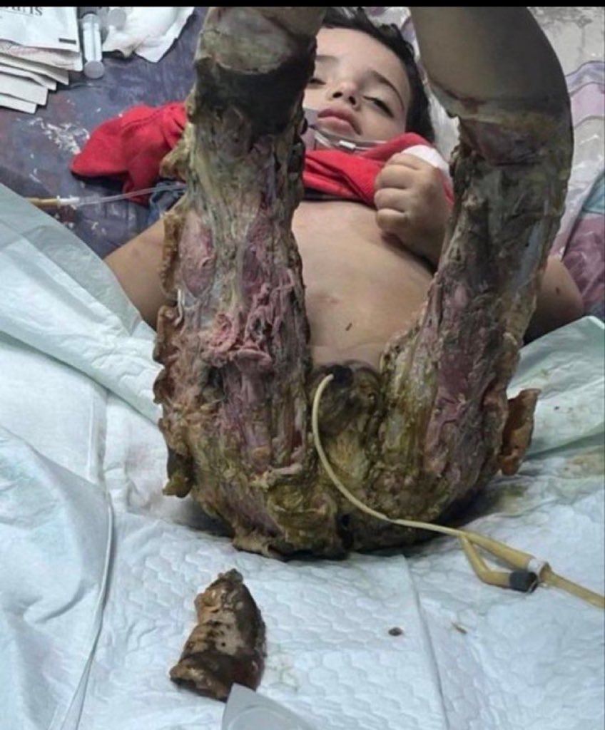 Belden aşağısı komple yanmış, vücut dokusunun önemli bir kısmını kaybetmiş bu küçük çocuğun Gazze gibi bir mahrumiyet bölgesinde, imkansızlıklar içinde ne kadar sağlıklı bir tedavi görebileceğini tahmin etmek zor değil.
