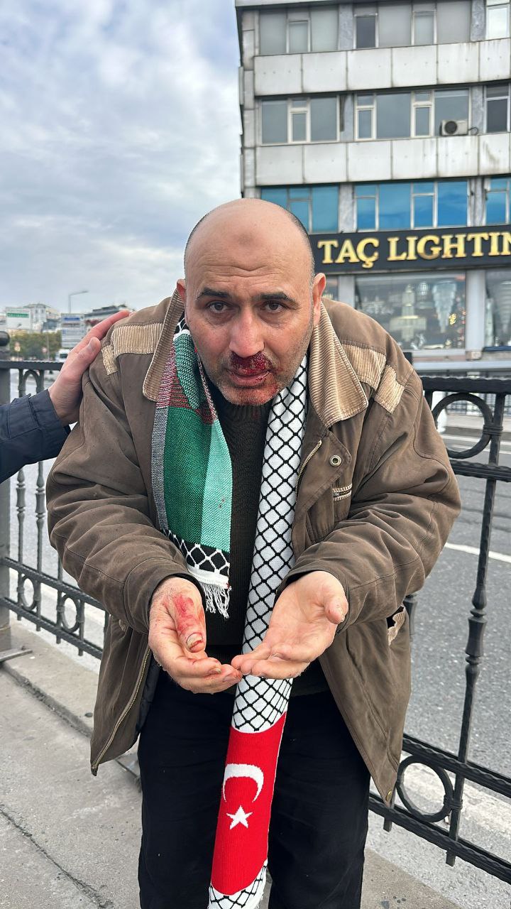 Bu sabah Galata Köprüsü’nde düzenlenen Filistin’e destek yürüyüşüne katılan İsmail Aydemir isimli vatandaş, elinde taşıdığı Kelime-i Tevhid bayrağına tahammülü olmayan bir kişinin saldırısına uğradı.