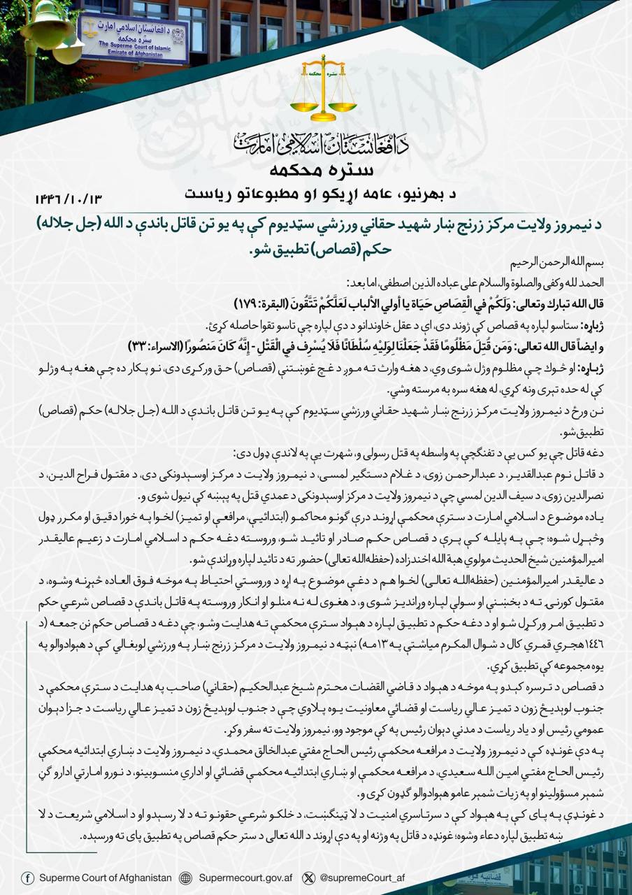 Bu bağlamda, 1446 Hicrî takviminin Şevval ayının 13’ünde (Cuma günü), Nimruz’un merkezi Zırranc şehrindeki spor stadyumunda halkın da hazır bulunduğu bir ortamda, kısas cezası uygulandı.