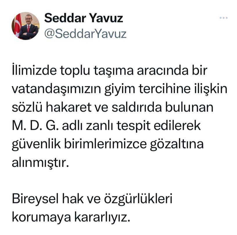 Kocaeli Valisi Seddar Yavuz, sosyal medya hesabından yaptığı açıklamada, “İlimizde toplu taşıma aracında bir vatandaşımızın giyim tercihine ilişkin sözlü hakaret ve saldırıda bulunan M.D.G. adlı zanlı tespit edilerek güvenlik birimlerimizce gözaltına alınmıştır. Bireysel hak ve özgürlükleri korumaya kararlıyız” dedi.