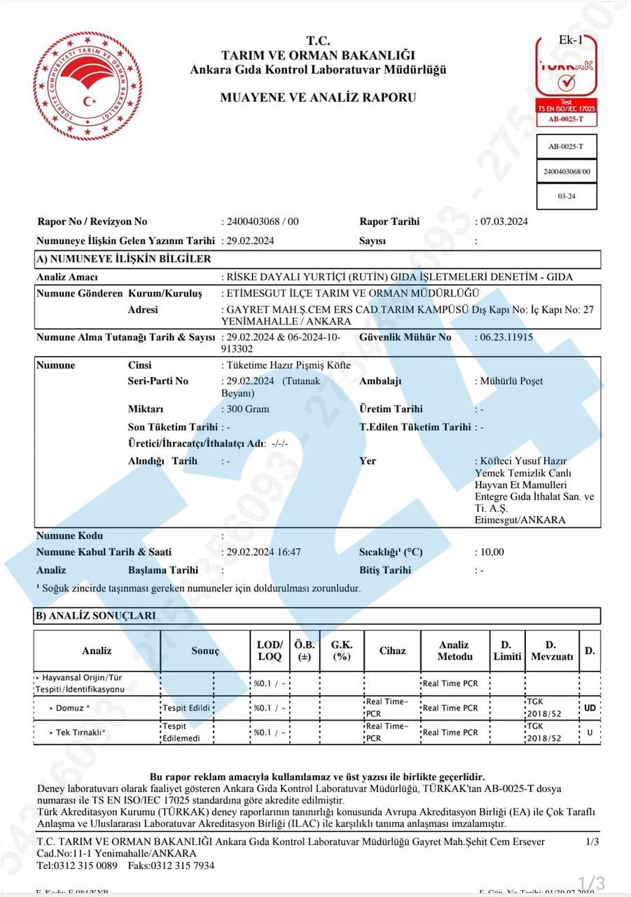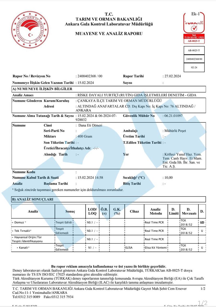 Tarım ve Orman Bakanlığı’nın 27 Şubat ve 7 Mart 2024 tarihlerinde Köfteci Yusuf’tan numune olarak alınan dana eti döneri ve tüketime hazır pişmiş köfte örneklerinde domuz etine rastlandı. Buna göre skandal gerçek, aylarca kamuoyundan saklanmış oldu.