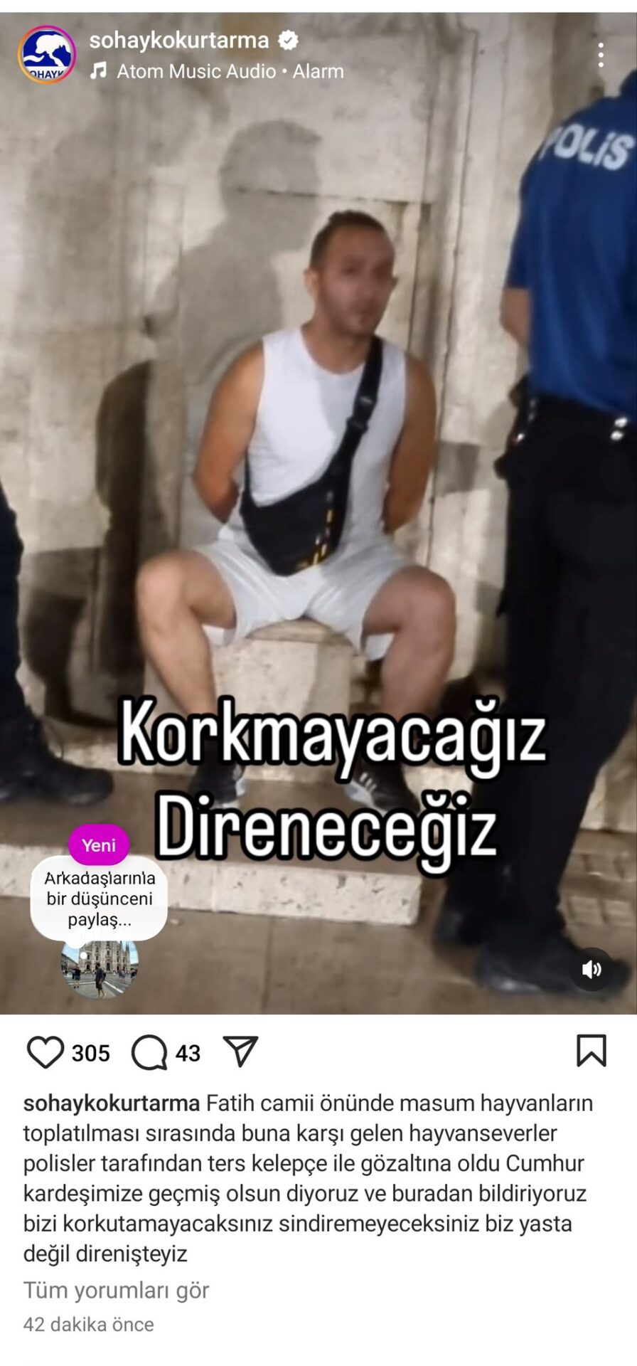 Öte yandan belediye ekiplerine engel olmak isteyen gruptan Cumhur isminde bir kişi gözaltına alındı. Sosyal medya üzerinde adeta örgütleşen köpekperestler, yasaya rağmen yetkilere meydan okuyor ve insan sağlığını ve can güvenliğinı tehdit eden köpeklerin ısrarla sokaklarda kalmasını istiyor.