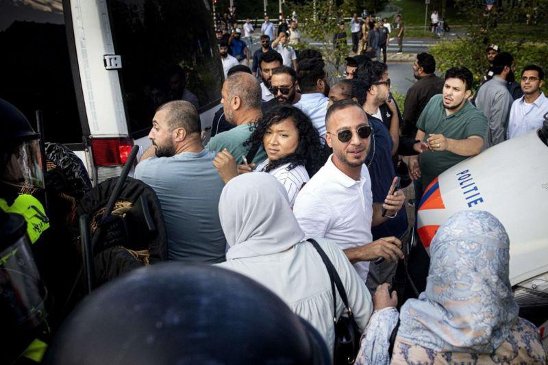 Büyükelçilik önünde toplanan karşı göstericilerin taşla karşılık verdiği göç ve İslam karşıtı örgütün lideri Wagensveld ve 2 arkadaşı korkarak İsveç polisine sığındı.
