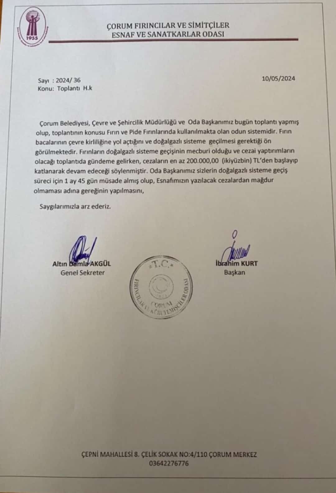 Çorum Fırıncılar Odası, fırıncı esnafımıza odun ateşinden, doğalgaz fırın sistemine geçmelerini söylemiş. Doğalgaza geçmeyen işletmelere de 200 bin TL ceza kesilecekmiş.