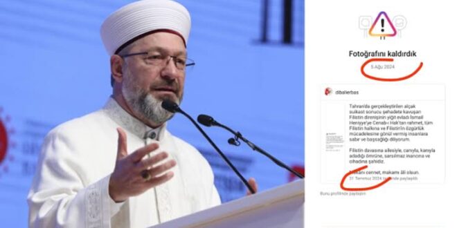 Diyanet İşleri Başkanlığı Basın Müşaviri Burak Orhan, Instagram’ın Diyanet İşleri Başkanı Ali Erbaş’ın 31 Temmuz 2024’te İsmail Haniye için yaptığı paylaşımı 5 gün sonra kaldırdığını açıkladı.
