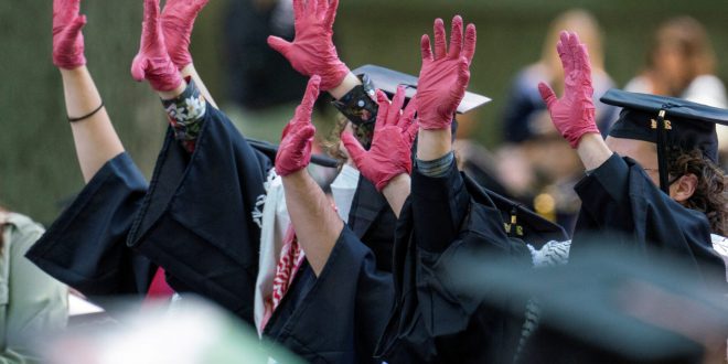 Onlarca mezun, işgalci İsrail’in Gazze’ye yönelik saldırganlığını, üniversite ile silah imalat şirketleri arasındaki mali ilişkileri protesto etti.