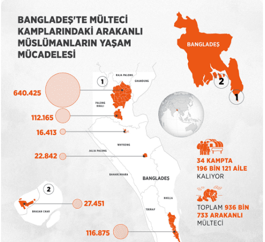 Birleşmiş Milletler Mülteciler Yüksek Komiserliği (BMMYK) kayıtlarına göre, Ağustos 2017’den sonra Arakan’daki baskı ve zulümden kaçıp Bangladeş’e sığınanların sayısı 936 bin 733’e ulaştı.