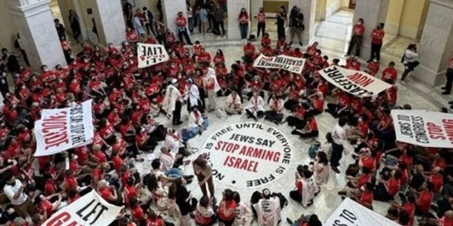 ABD Kongresi’ni basan Yahudi aktivistler, Kongre’ye hitap etmek üzere Washington’a gelen Siyonist İsrail Başbakanı Binyamin Netanyahu’ya karşı protesto düzenledi ve Gazze’de acil ateşkes çağrısında bulundu.