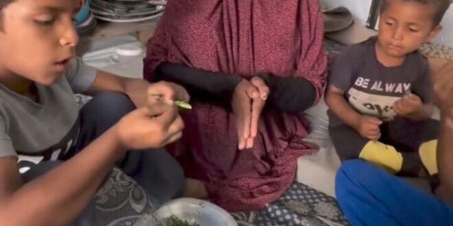 İşgalci İsrail’in yıllardır uyguladığı ağır abluka, Gazze’de sivillerin yaşamını dayanılmaz bir hale getirdi. Açlıktan bitkin düşen bir Filistinli anne ve küçük çocukları, hayatta kalabilmek için ağaç yaprakları yemek zorunda kaldı.