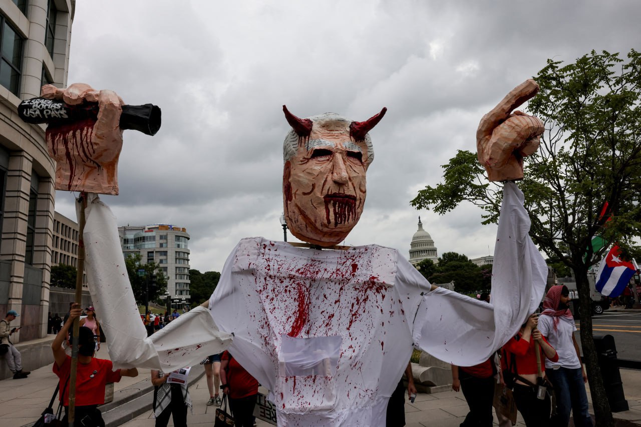 Beyaz Saray ile Kongre arasındaki caddeyi trafiğe kapatan kalabalık “Özgür Gazze” ve “Soykırımı durdurun” sloganları attı. Filistin yanlılarının hazırladığı, Netenyahu’nun boynuzlu şeytan şeklindeki kuklası dikkat çekti.