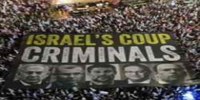Kaplan Caddesi’nde her hafta bir ana sloganın yer aldığı dev pankart açan göstericiler, bu hafta, Netanyahu, Adalet Bakanı Yariv Levin ve aşırı sağcı isimlerin resimlerinin yer aldığı “İsrail darbesinin suçluları” yazılı pankartı taşıdı.