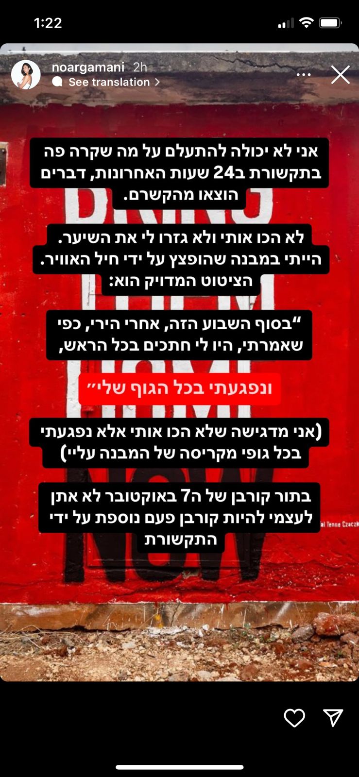 Argamani, Instagram sayfasında yaptığı bir paylaşımda İsrail basınında kendisiyle ilgili yapılan haberleri yalanladı: “Son 24 saatte medyada olanları görmezden gelemiyorum. Olaylar bağlamından koparıldı.”