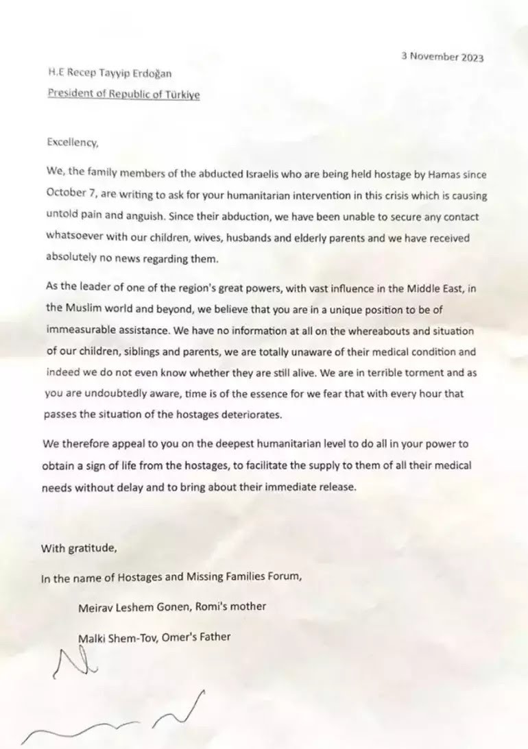 Bölgenin büyük güçlerinden birinin lideri ve Orta Doğu’da geniş etkisi olan biri olarak büyük destekte bulunabileceğiniz eşsiz bir konuma sahipsiniz. Çocuklarımızın, kardeşlerimizin ve ebeveynlerimizin nerede olduklarını bilmiyoruz. Sağlık durumlarından ve hayatta olup olmadıklarından haberimiz yok. Korkunç bir acı altındayız. Sizin de bildiğiniz gibi zaman çok önemli. Her geçen saat rehinelerin durumunun kötüleştiğinden endişeleniyoruz.