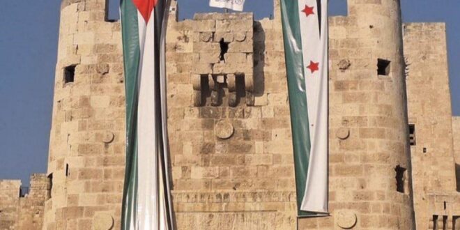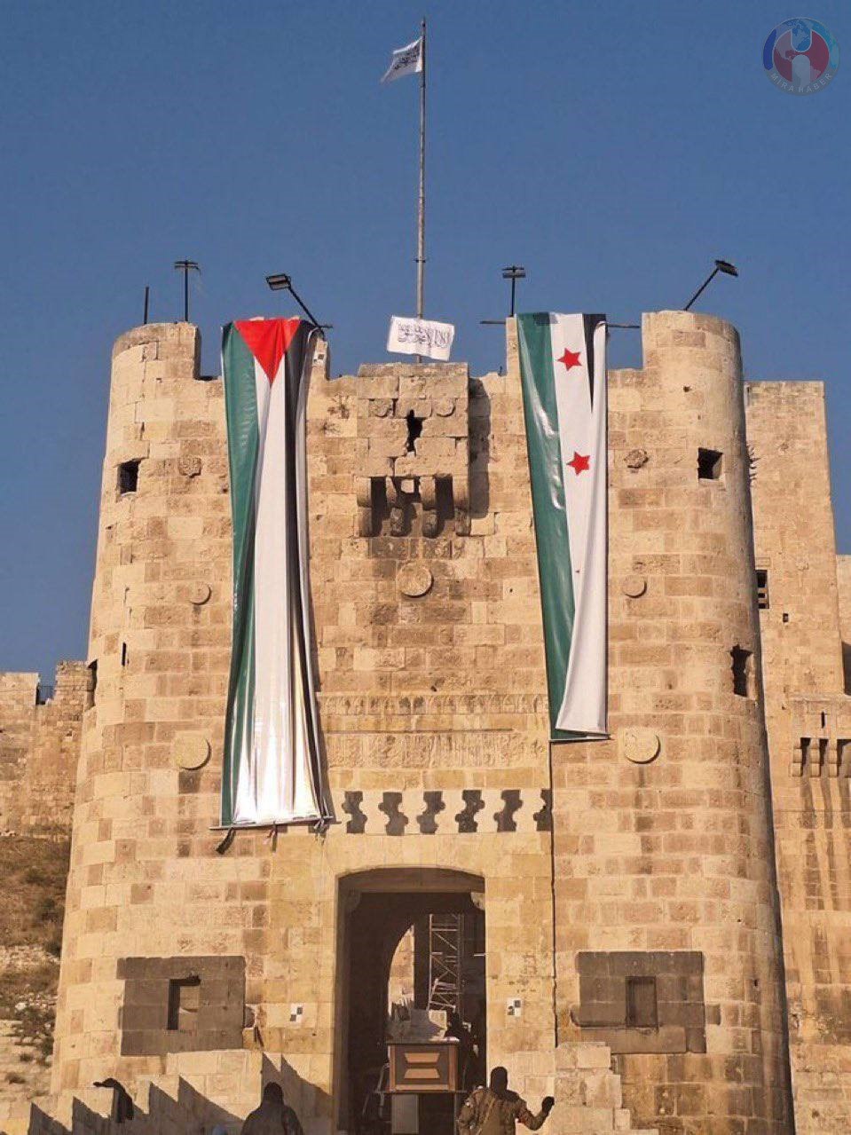 Muhalifler, Halep Kalesine Filistin bayrağı asarak Filistin direnişinin yanında olduğunu mesajını verdi.