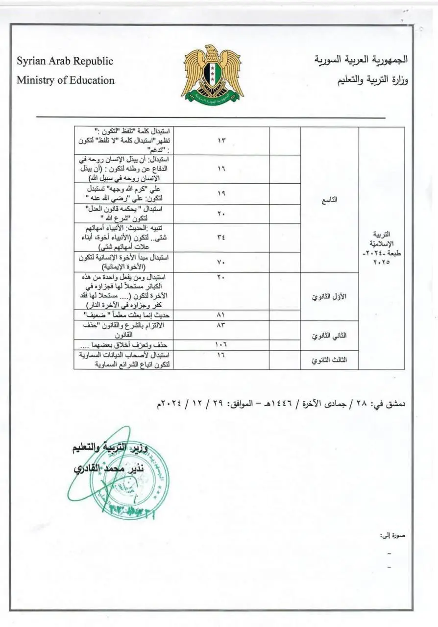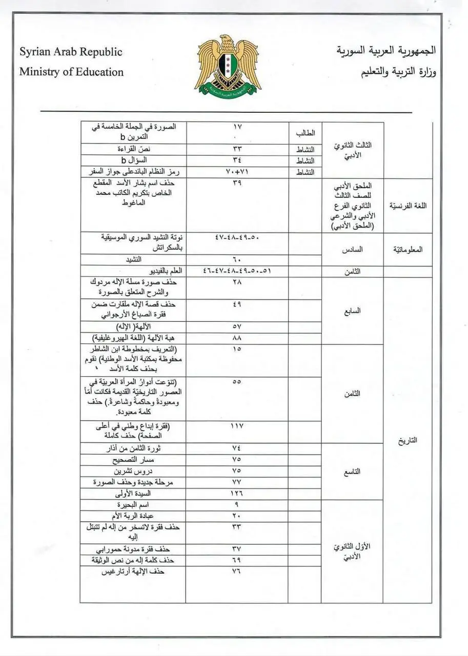 Bakanlar kabinesinin tamamen değişmesinin ardından yeni Eğitim Bakanı, Nazir el-Kadri olmuştu. Halen rejimin kalıntılarından temizlenmeye çalışılan Suriye’de, okul müfredatlarında bazı ibareler değiştirildi.