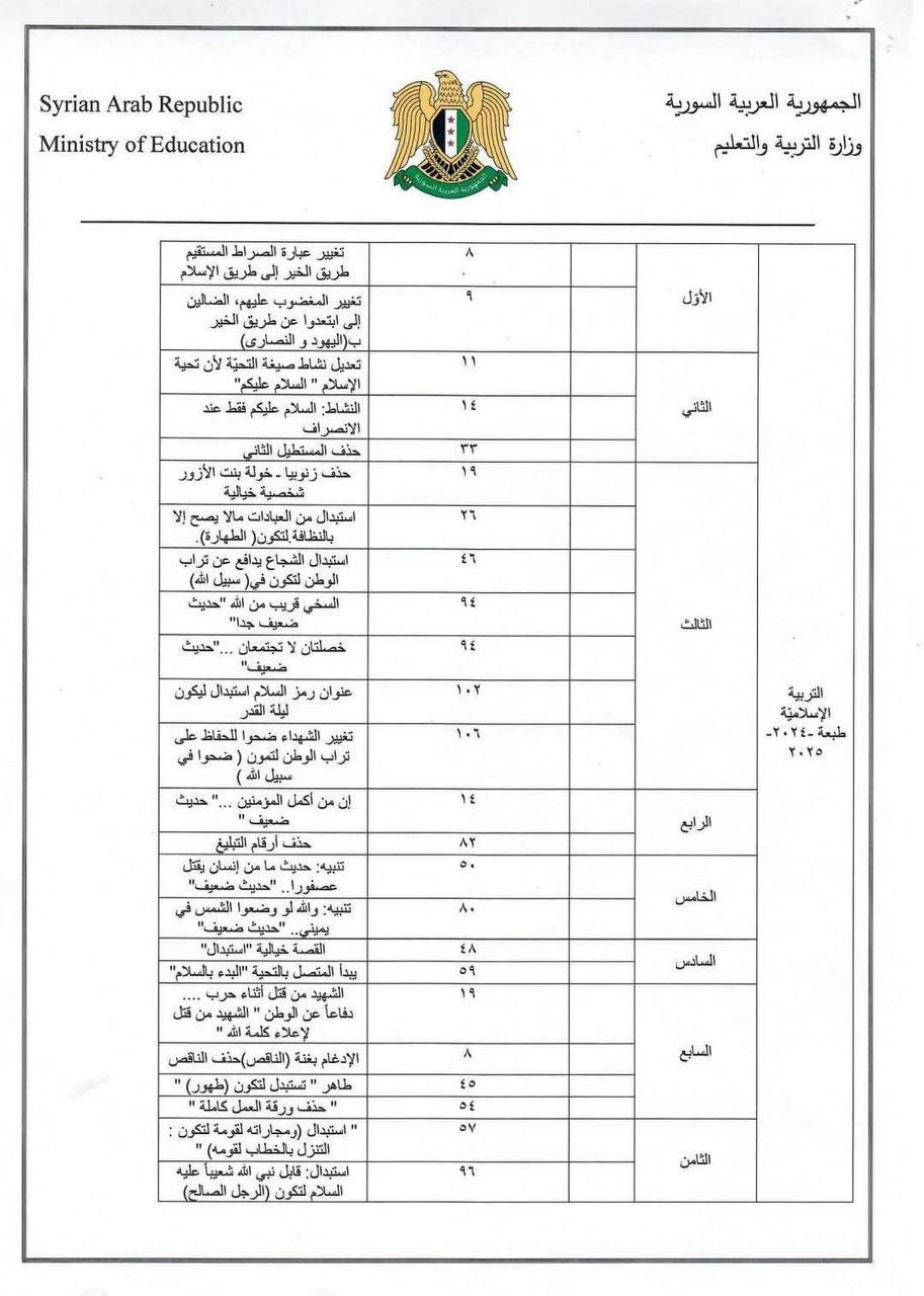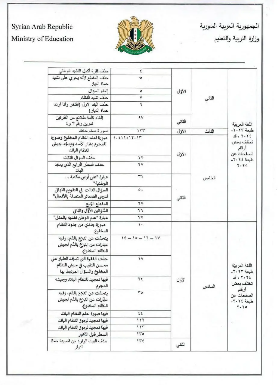Ayrıca kitaplardan eski Suriye bayrağı ve sembolleri, Esad ailesinin resimleri ve onlar övgü içeren sözler kaldırıldı. Kitaplarda geçen selam şekli “Esselamu Aleykum” olarak değiştirildi.