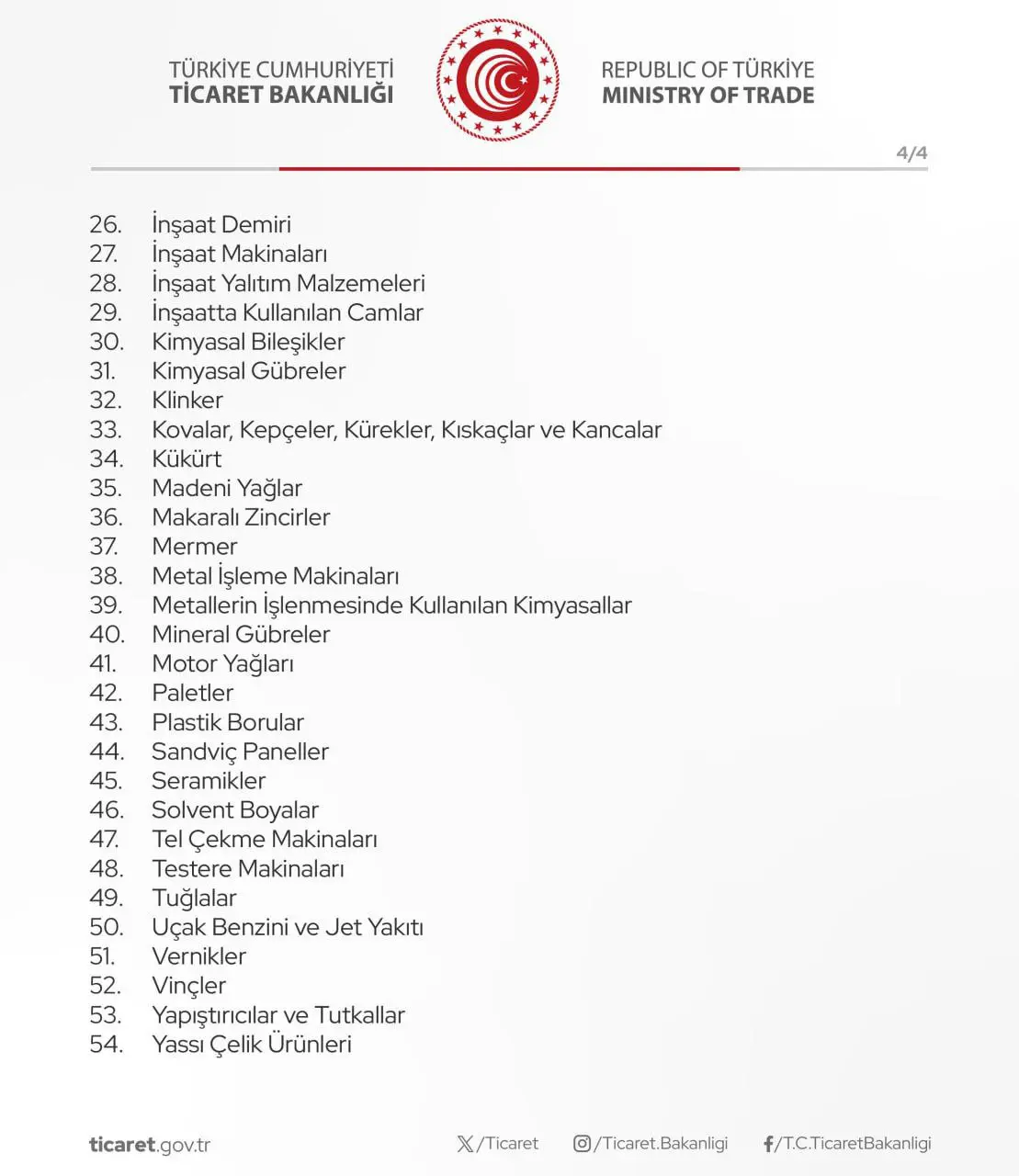 Bakanlık, derhal yürürlüğe girmek üzere, alüminyum tel, çelik, çimento, inşaat malzemeleri, granit, kimyasallar, böcek ilaçları, motor yağları, jet yakıtı ve tuğla gibi ürünleri kapsayan 54 ürünün İsrail’e ihracatını kısıtladı.