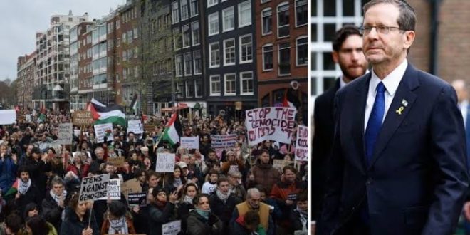 İşgalci İsrail Cumhurbaşkanı Isaac Herzog, Holokost Müzesi’nin açılışı ve resmi ziyaret kapsamında bulunduğu Hollanda’nın başkenti Amsterdam’da protesto edildi.