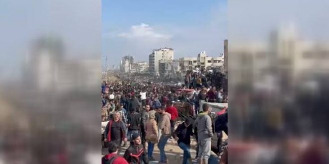 Binlerce Filistinli, uluslararası yardım kuruluşları tarafından ulaştırılan gıda yardımlarından alabilmek için Gazze kentinin Tel el-Heva Mahallesi’ndeki Er-Raşid Caddesi’nde toplandı.
